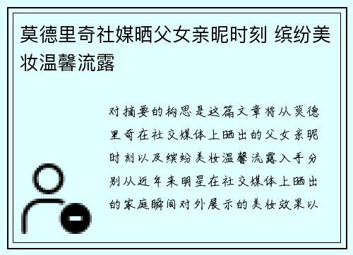 对摘要的构思是这篇文章将从莫德里奇在社交媒体上晒出的父女亲昵时刻以及缤纷美妆温馨流露入手,分别从近年来明星在社交媒体上晒出的家庭瞬间、对外展示的美妆效果,以及充满温暖的家庭氛围等四个方面进行详细阐述,并通过对这些内容进行总结归纳,展示莫德里奇的社交媒体形象。1、家庭瞬间莫德里奇在社交媒体上频繁晒出与...